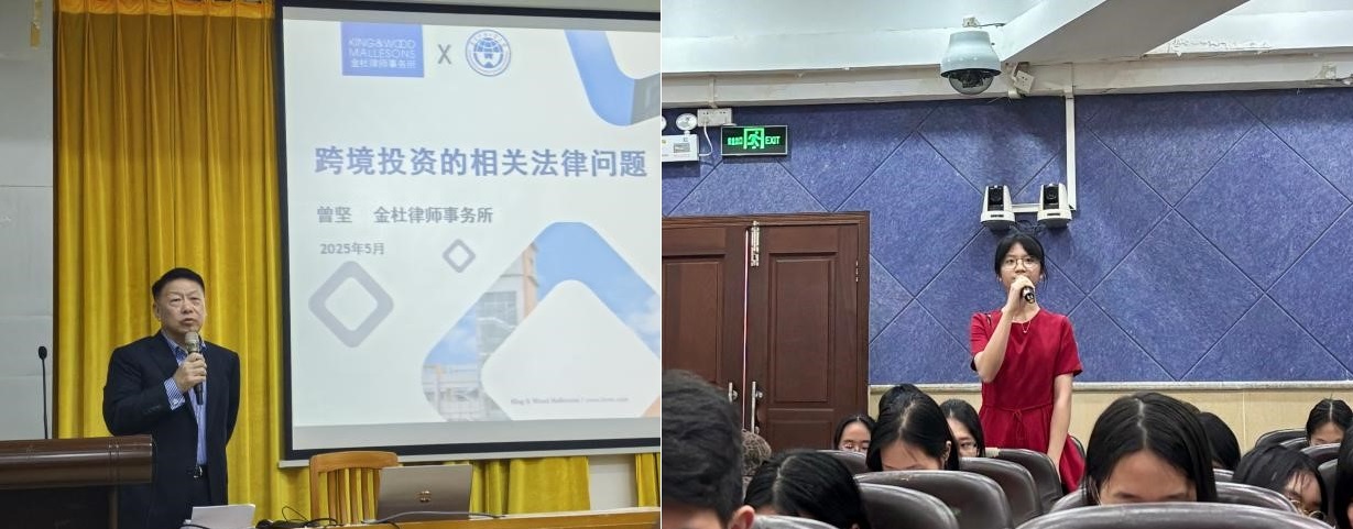 为深化员工专业知识理解、提升职业素养与实践能力,5月22日下午,williamhill官方网站于白云山校区水上报告厅成功举办“行业专家进课堂系列活动”。活动特邀金杜律师事务所合伙人曾坚律师担任主讲嘉宾,为师生带来主题为“跨境投资相关法律问题”的精彩讲座。公司经理胡春雨、党委书记苏冬燕、副经理汪谓超、党委副书记杜焕君,以及各系主任、相关专任教师出席活动,23级法英专业、24级法双专业员工参与其中,共同聆听行业前沿经验。