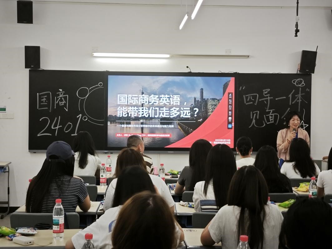 随后,国商2401班校外导师、上海钢联能化创始人廖娜结合自身工作经历为师生带来主题分享。首先,她从对专业理解的角度出发,提出国际商务的专业培养是希望同学们具有国际的视野、对商务的业务理解以及要学会将英语用作放大器讲出逻辑与价值。其次,她结合工作实际从企业的角度出发向同学们分享了“ACE”模型,即要培养自身的执行力(Act on it)、理解力(Catch it)与表达力(Explain it),为同学们应该如何理解与学习自己的专业,提升自己的综合能力做出了宝贵建议。活动中,班级导师孙肇春老师分享了对于同学们的殷切期望以及未来期许,激励同学们在大学的四年中不断提升自身专业素养,努力奋斗。国商2401班班长丁云泠同学也介绍了班级基本情况、现存问题以及未来规划,向导师们展现了国商2401班的精神风貌。