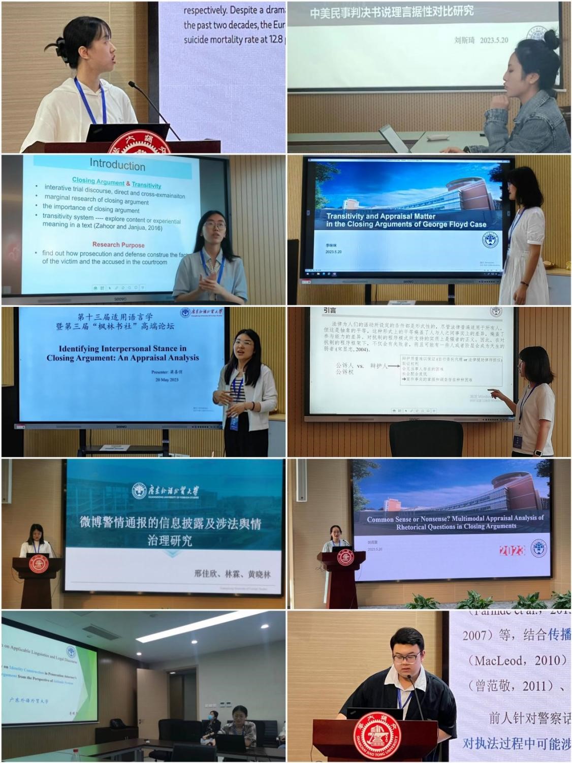 在本次论坛中,公司研究生表现出色,充分彰显了广外学子的风采。分论坛上,公司10名法律语言学方向硕士研究生宣读了论文,展示了自己的研究。22级黄曼平基于系统功能语言学的介入系统研究了劳荣枝案庭审话语;李咪咪、陈淑妍、李明月、梁喜俏、姚雨萱及刘梓涵等基于系统功能语言学,从不同角度研究了弗洛伊德案的庭审结案陈词与警情通报,林荣萱基于语篇信息理论和关键词探究了微博文本自杀意图的检测及文本真伪鉴定。21级邢佳欣基于语篇信息理论,研究了警情通报文本及其网友评论,探讨了微博警情通报的涉法舆情治理现象及未来完善的路径;刘斯琦对比分析了中美民事判决书中的说理言据性,旨在寻找能提高我国判决书说理充分性在语言学领域的新方法。
