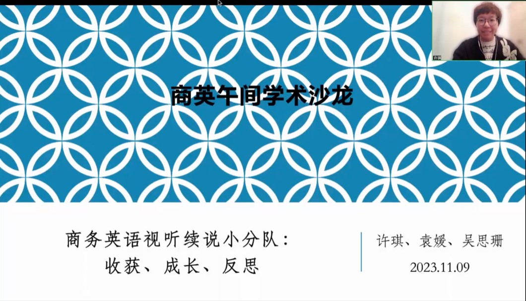 为深入学习贯彻习近平新时代中国特色社会主义思想,积极推进williamhill官方网站科研发展和研究交流,公司于2023年11月9日在线上开展了本学期第二次午间学术沙龙。商务英语教学研究团队的许琪、袁媛、吴思珊三位老师进行了题为“商务英语视听续说小分队:收获、成长、反思”的分享。公司副经理刘平、汪谓超以及20多位来自不同公司的老师和同学参与了本次活动。