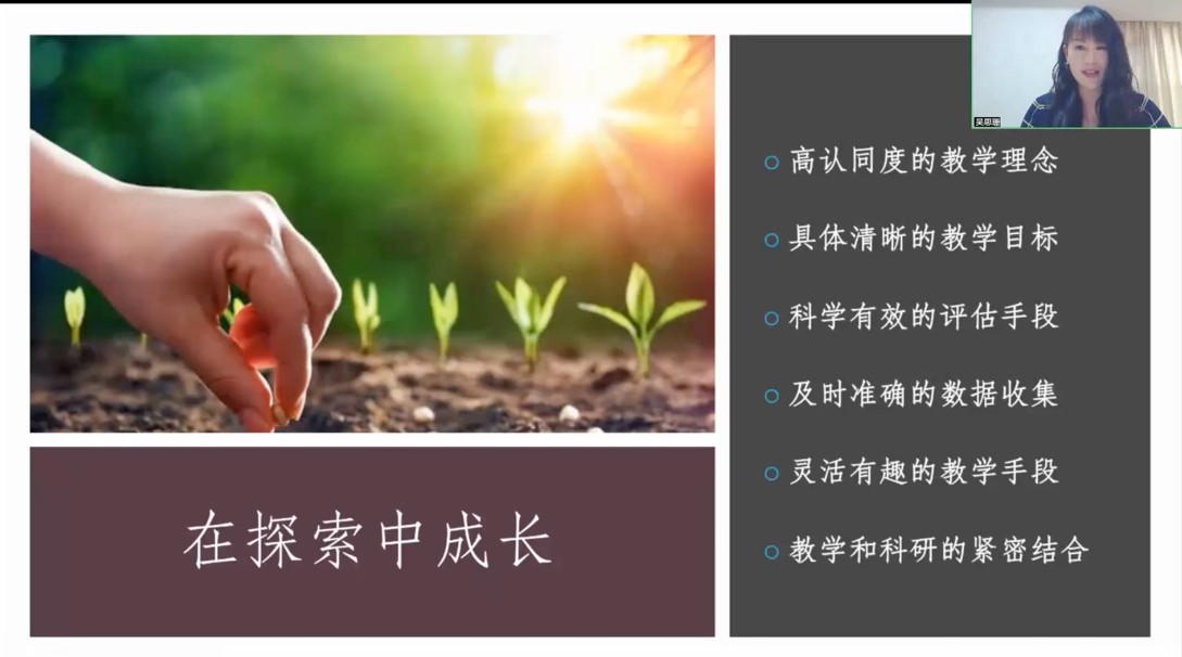 紧接着,吴思珊老师分享了她在视听续说教学与科研探索中成长的过程,总结出以下心得体会:高认同度的教学理念、具体清晰的教学目标、科学有效的评估手段、及时准确的数据收集、灵活有趣的教学手段。她特别强调了教学与科研的紧密结合不仅有利于教师自身发展,还可以为员工提供更具深度和广度的学习体验。