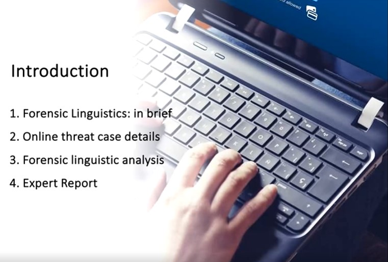 在第一部分,Royce教授简单介绍了法律语言学这门学科的基本定义以及其所涉及的研究范围,并举例说明了法律语言学可以应用的具体场景,重点介绍了了用于分析本次案件的法律语言学研究领域—文本作者身份识别。