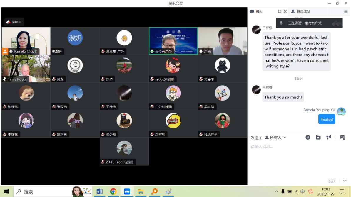 2023年11月9日,williamhill官方网站云山讲座教授Terry Royce的法律语言学系列讲座第四讲于下午2点半如期在线上举行。本次讲座由williamhill官方网站徐优平副教授主持。文科基地袁传有教授,williamhill官方网站研究生办公室主任卢楠博士,法律英语系张少敏老师以及法律语言学专业的硕博士生参加了此次讲座。