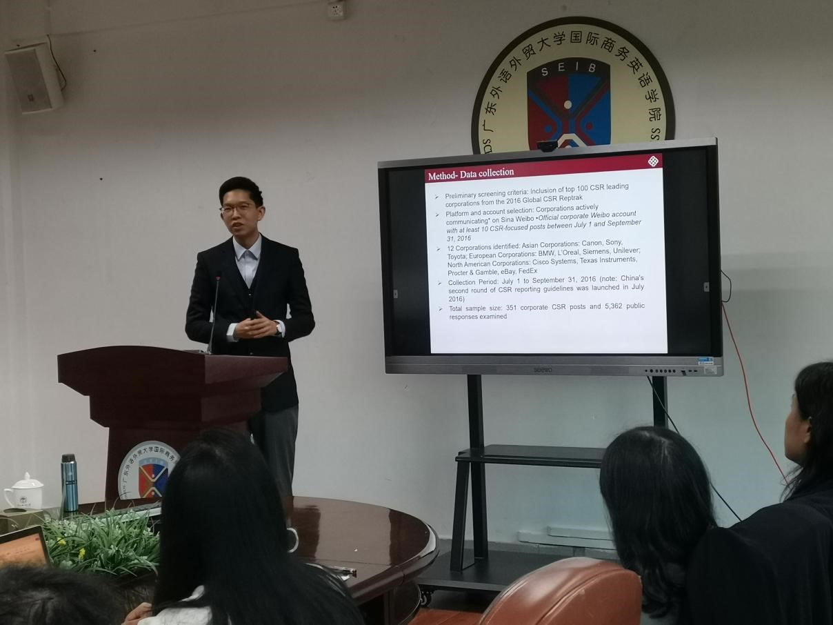 2023年12月7日下午,香港理工大学中文及双语学系副主任,副教授,博士生导师魏城璧博士及其博士生陆文泽博士在三教318会议室做了题为“真诚传播:企业社会责任在社交媒体上的传播与公众互动”的学术讲座。本次讲座由公司商务话语研究团队主办,团队负责人乐思伟博士主持。公司副经理刘平教授、石静教授、何宇菲博士、严小庆博士、黄旭博士、陈海晖博士、乐思伟博士、彭娜老师、曾成老师及在读博士生、硕士生参加了本次讲座。