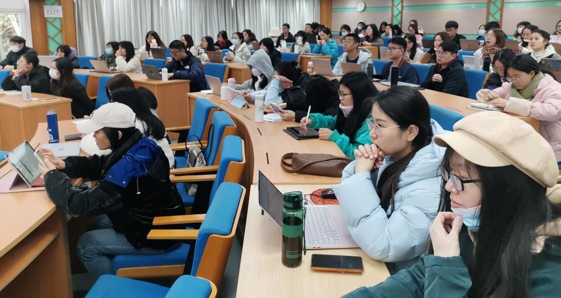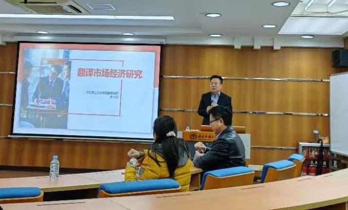 王教授的讲座围绕“什么是翻译市场经济”、“什么是翻译产业链”,以及“翻译市场经济有哪些研究方法”这三个问题展开。王教授首先介绍了翻译市场经济研究的核心概念、发展历程,国内外翻译市场经济研究现状,构建翻译市场经济评价的指标体系,提出翻译市场经济的研究重点,分享了一系列的研究方法,并用案例说明如何运用跨学科方法开展翻译市场经济研究。此外,王教授结合数据分析以及自身科研经验,提出我们已进入智能化商务英语时代,传统贸易正在进行数字化转向,商务英语要进行服务能力转向、智能转向、数字人文转向,而译者身份也应当向国际传播转向。