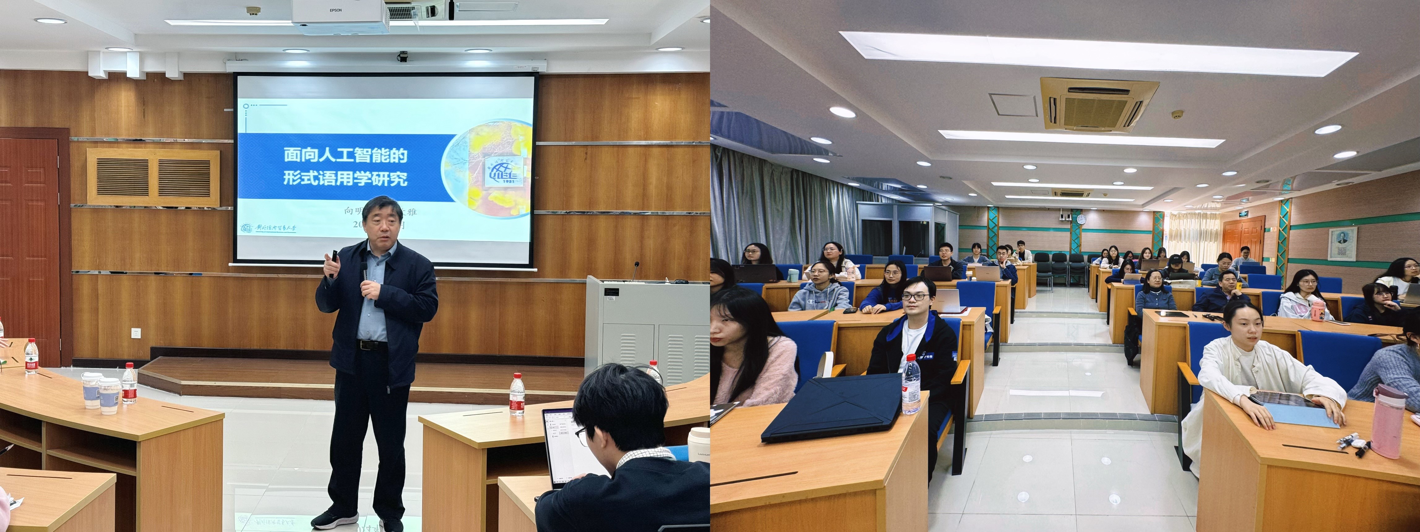讲座伊始,向明友教授从乔姆斯基与辛顿之争谈起,点明大语言模型时代的到来是人类不断探寻真理的必然结果,以及语言智能研发的重要性。通过发现“大数据+弱规则”生成式大语言模型不足之处,辅以形式语用学为代表的“小数据+强规则”模型可取之处,向明友教授找到了语言学与人工智能深度融合的结合点,将经济学的角度纳入了语言学研究中,把语言学理论公式化、形式化并弥补形式主义的空缺。
