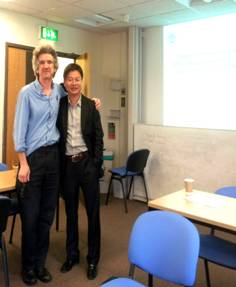 图一、袁传有教授讲座中 图二、讲座后与Tom Bartlett合影
