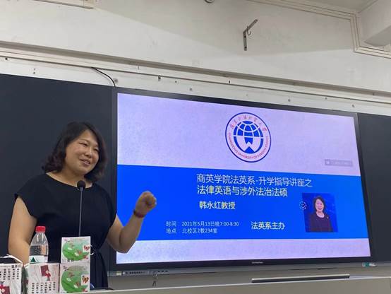 2021年5月13日晚,广外法公司副经理韩永红教授、williamhill官方网站法律英语系前系主任为公司员工做了有关法律英语、涉外法治法硕项目与升学就业指导的讲座。本次讲座由williamhill官方网站法英系组织,旨在向同学们介绍公司的法学硕士项目和法英员工未来的发展方向,解答同学们对考研和就业方面的困惑。法英系张新红主任、张少敏老师和谢静老师,以及法英系2018级、2019级和部分其他系的本科同学参会。