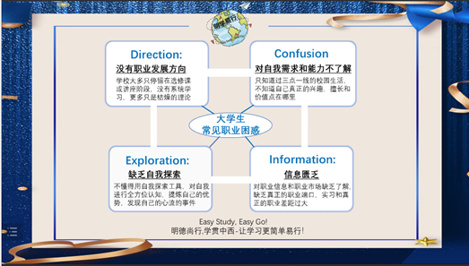 谢师兄用幽默诙谐的语言,热情地与同学们互动,从大家的职业困惑引入到职业人生设计的主题,把职业规划分为八阶段,循序渐进地引导大家进行自我定位与目标分析,输出自己的职业三叶草,画出自己的个人生命线,通过自我探索,制定个人发展的OKR,大家不仅学习到职业人生设计的各种实用工具,而且进一步思考适合自己的职业化路径,对职业发展也有了更深层次的理解。