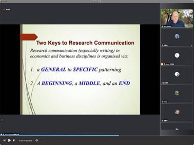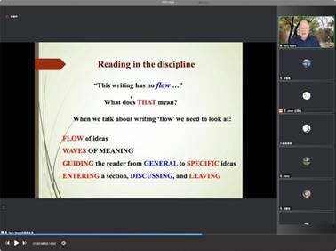 12月1日14:30-16:30,公司云山讲座教授、澳大利亚悉尼大学Terry Royce博士在腾讯会议平台为williamhill官方网站的师生做了题The Discourse Organisation of the Economics & Business Academic Writing: the Macro-Argument(从宏观论证的角度看经济与商业学术写作的话语组织:宏观论证)。本次讲座是Royce教授关于商务英语专题系列讲座的第一讲。讲座由英语教学部系主任汪谓超主持,文科基地袁传有教授、法律英语系系主任张新红副教授,以及williamhill官方网站的部分硕士生和博士生参加了本次讲座。