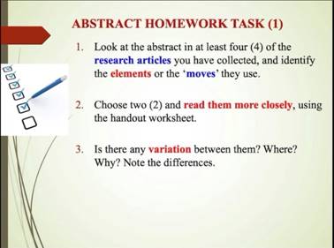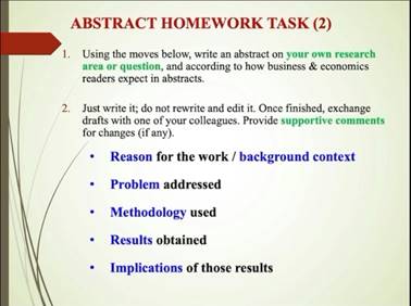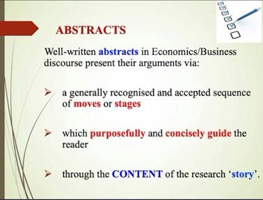 在讲座的第二部分,Terry Royce教授主要围绕Abstract的写作展开。首先,他提到,一篇好的摘要,除了需要有完整流畅的Moves和Stages,需要能够有目的地带领读者进入到文中,还需要有贯穿整篇文章的脉络。接着,Terry Royce教授介绍了Abstract的基础成份,即Reason for the Work,Problem Addressed,Methodology Used,Results Obtained和Implications of Those Results。