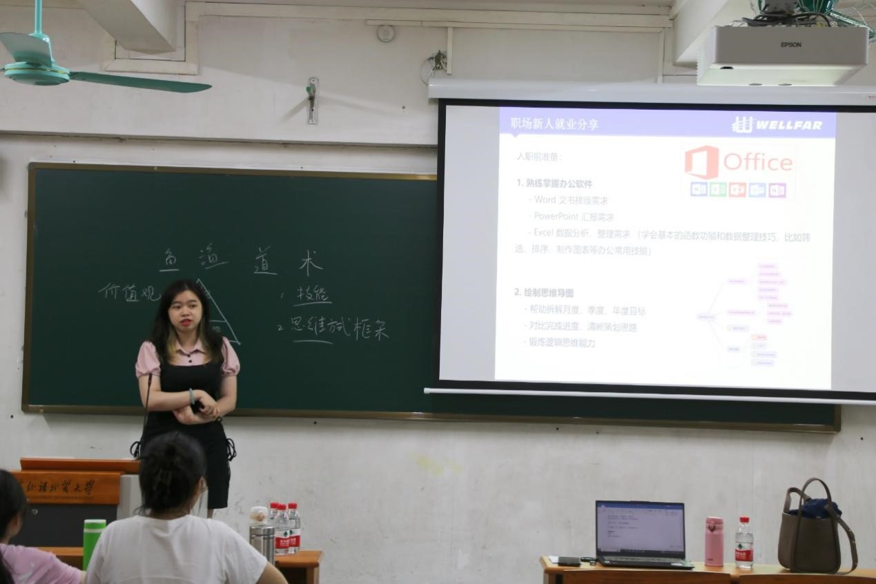 6月27日,williamhill官方网站经贸英语系主任何宇菲带领商英学子在实践周举办了“外资/民企就业前景和商英/国商专业求职经验”为主题的学习分享会。活动邀请了经贸英语系的实习基地,同时也是我们的员工企业---锦翰网络(广州)科技有限公司共同组织和参与。主讲人为王征豫(锦翰CEO),宋百苓(锦翰人力资源总监),梁钰淇(锦翰新媒体运营岗,2018级国商创新班员工)。本次分享会通过讲解互动的方式,旨在让员工了解外资、民企就业前景,实现更清晰的自我定位;以及如何通过自主学习得到赋能加持,适应未来职场需求。