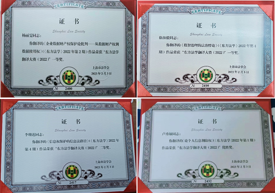 近日,williamhill官方网站法律英语系员工在东方法学翻译大赛(2022)中荣获佳绩!该翻译大赛是由上海市法学会举办,面向全国各高校员工的学术竞赛,宗旨为促进智慧法治学术成果国际传播并为法学翻译人才搭建脱颖而出的学术平台。自2022年7月份发布赛事公告后,公司邓朝霞老师积极发动法律英语系员工参赛、备赛,并在后续参赛员工的稿件翻译及修改中给予了指导。最终,法英2001班杨丽雯同学和法英2003班徐淑毅同学荣获大赛一等奖;法英2003班李珊莲荣获二等奖;法英2003班卢秀敏同学荣获优胜奖。