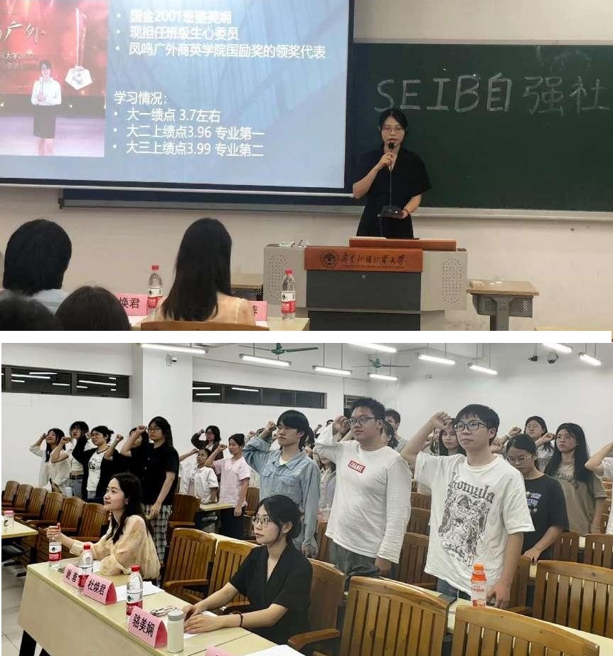 在由社长宁东杰带领全体社员的庄严宣誓中本次成立大会接近了尾声,相信通过此次会议,商英SEIB自强社能够在未来的工作中更进一步,更加坚定“自立自强,育己助人”的人生信念,更好地肩负起新时代青年的使命与担当。