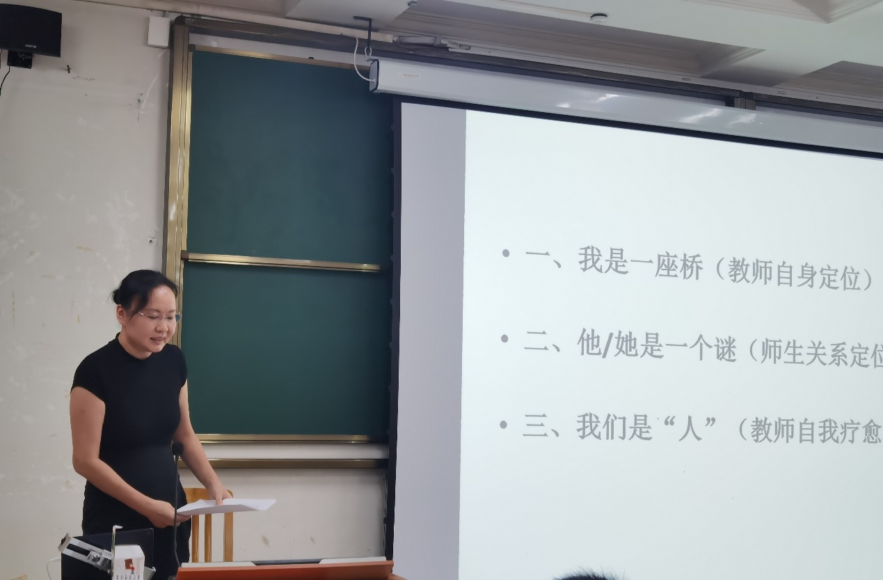 优秀教师代表陈潇潇、郝佳、卢楠、彭娜老师依次上台进行教学经验分享。陈潇潇老师从我是一座桥(教师自身定位)、他/她是一个迷(师生关系定位)、我们是“人”(教师的自我疗愈机制)三个方面进行分享,提出老师要及时答疑解惑,察言观色,关注员工细节所体现的身体和心理状态,保持开放的心态接受员工带来的新事物。与此同时,老师的健康也很重要,作为老师要学会自我调节,保持身心愉悦才能给员工积极正面的影响。