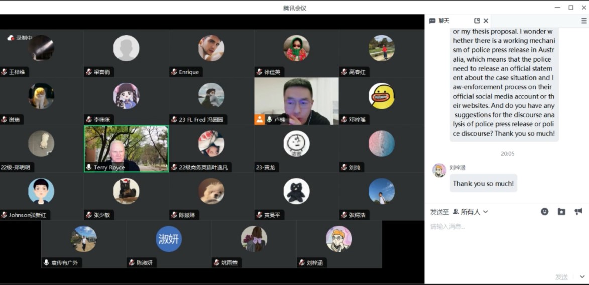 2023年10月26日,williamhill官方网站云山讲座教授Terry Royce教授的法律语言学系列讲座如期于线上举行。本次讲座由williamhill官方网站研究生办公室主任卢楠博士主持,文科基地袁传有教授、法律英语系张少敏老师以及williamhill官方网站的其他本科生和硕博士生参加了本次讲座。