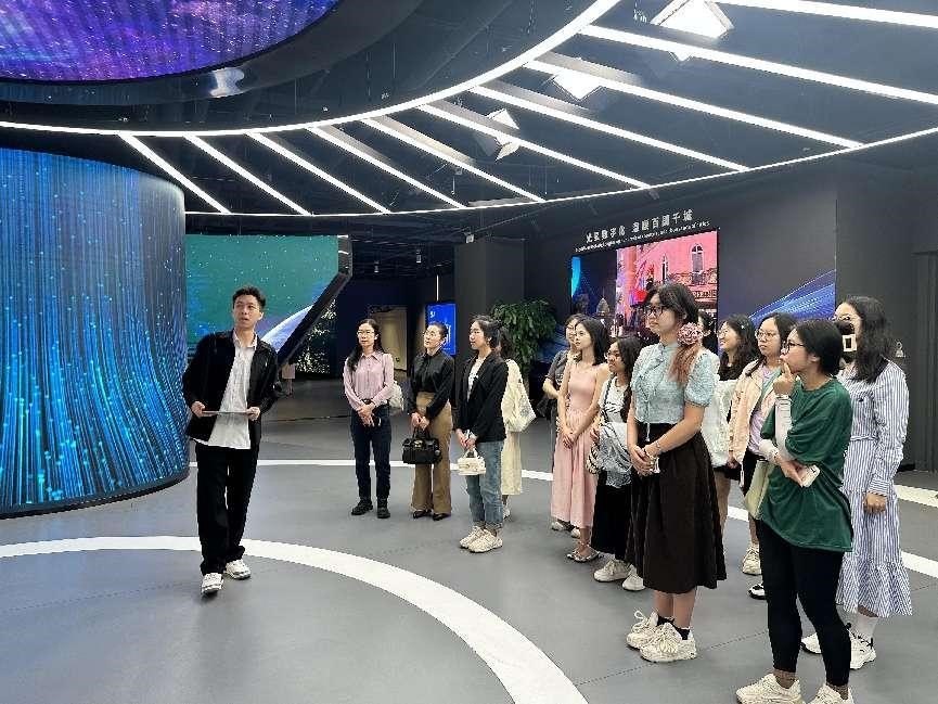 到达目的地后,在洲明员工和西语公司23届希腊语员工梁健佳的带领下,师生们先是参观了企业的展厅,了解了光显技术的演进历程和洲明产品的经典应用场景,还亲身体验了先进光显技术的魅力。