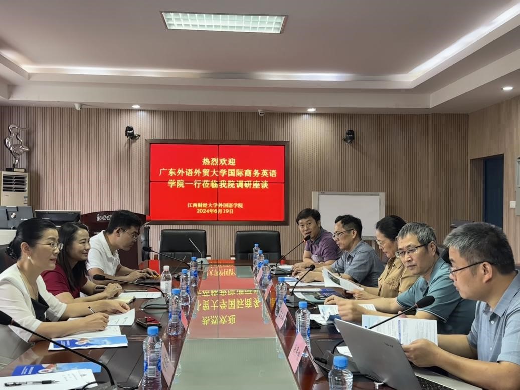 6月19日上午,杜书记一行首先来到江西财经大学外国语公司,在麦庐园英庐与财大外院领导开展了座谈会。本次会议由财大外院副经理杜景平主持,江西财经大学外国语公司张曦凤、副经理涂年根、副书记左家盛、副经理张善军等领导及老师参加了会议。