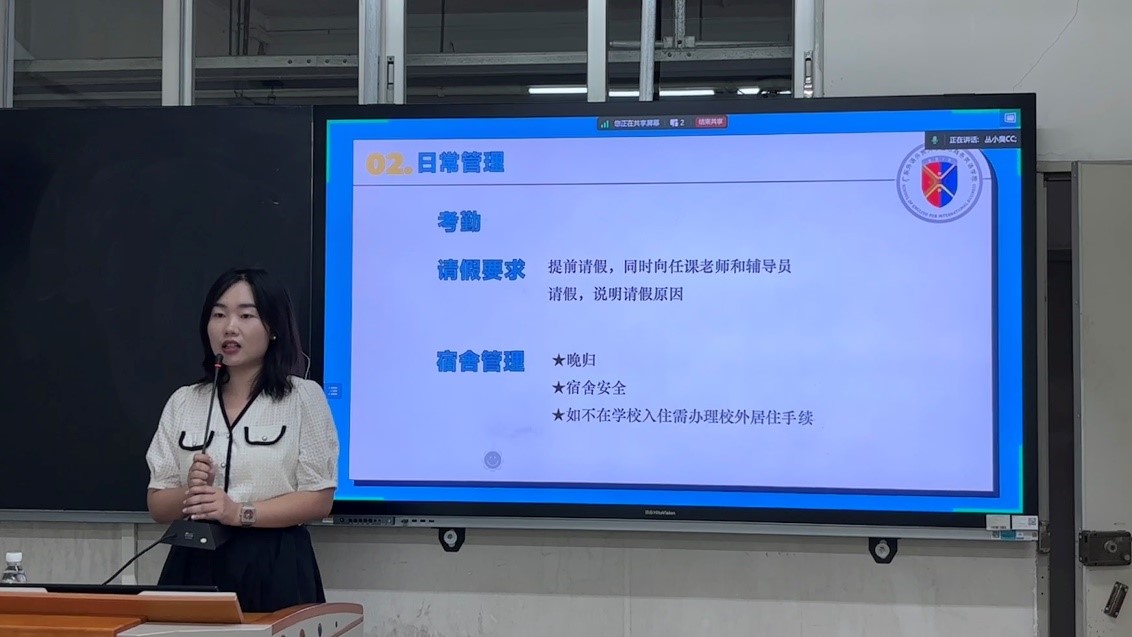 辅导员陈思蓓老师介绍了班级的日常管理事项,要求同学们遵守相关管理规定,提醒新生注意防范网络诈骗。