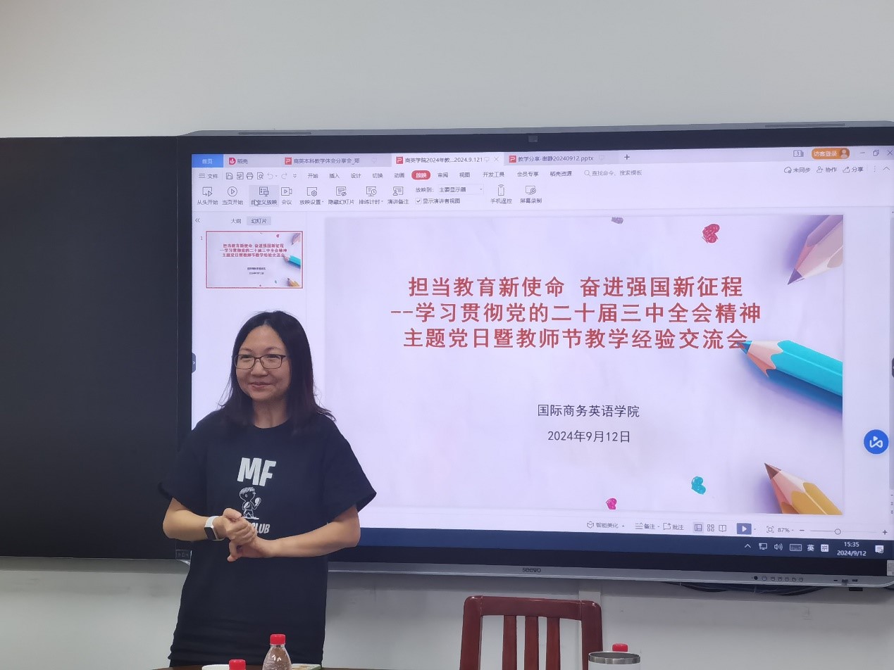 9月12日下午,williamhill官方网站在北三教331召开以“担当教育新使命 奋进强国新征程--学习贯彻党的二十届三中全会精神”为主题的党日活动暨教师节经验交流会,学习贯彻党的二十届三中全会精神,并邀请上学期评教分数前列的教师代表和出国学习访学的教师分享经验,进行交流座谈。公司经理胡春雨、系主任、副系主任、新进教师和其他专任教师共计三十余人参加,会议由教学副经理汪谓超主持。