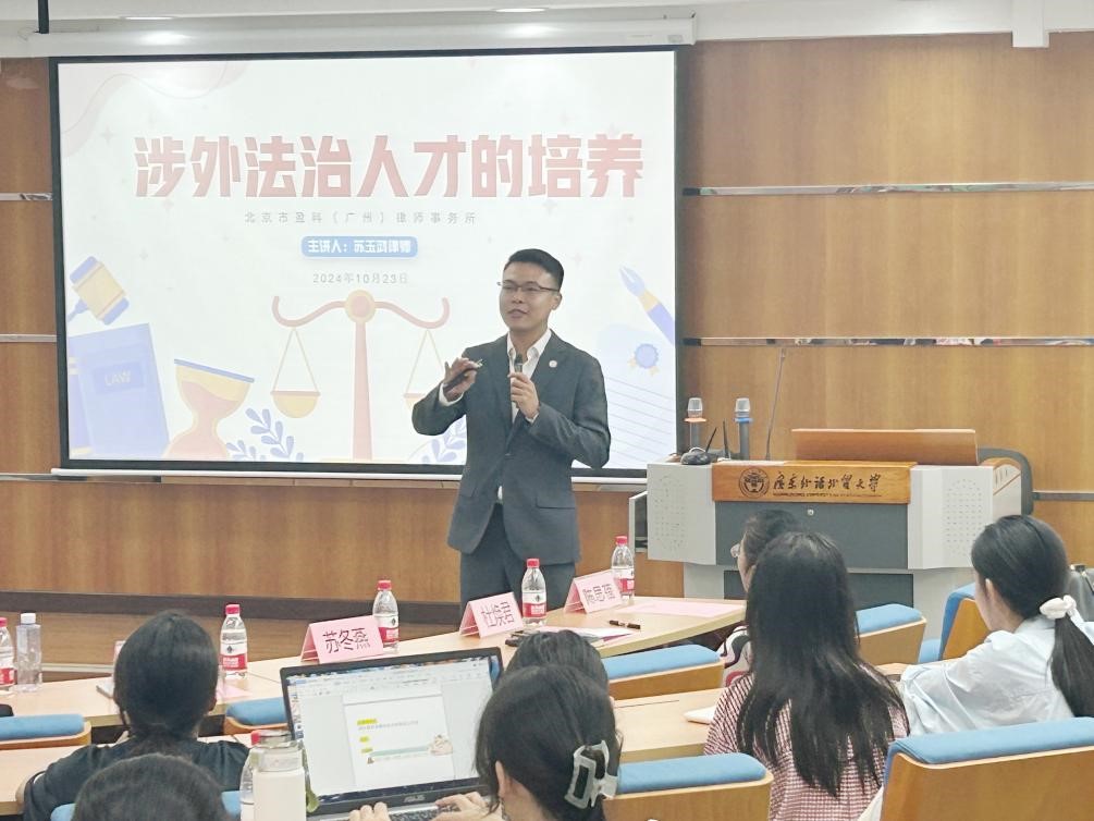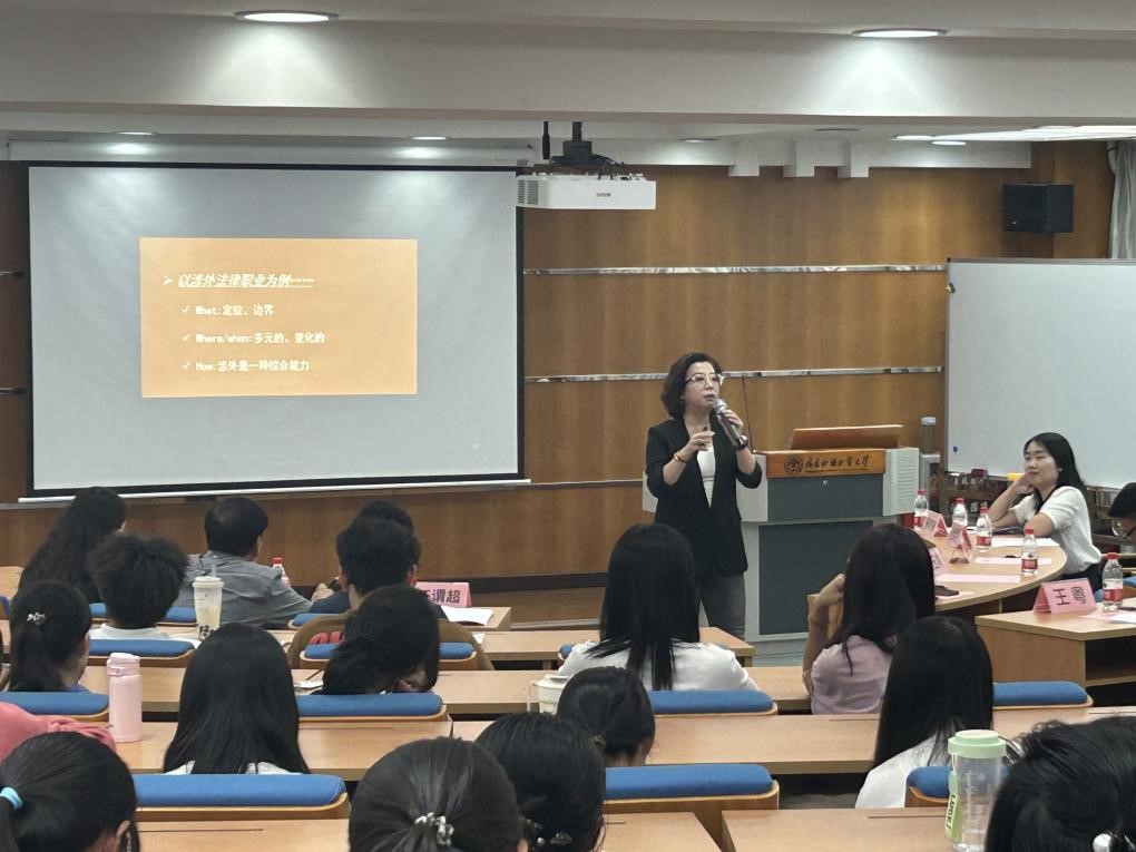 紧接着,苏玉鸿与翟彩娟作为班级校外导师分别向同学们作主题讲座。苏玉鸿律师首先通过诙谐幽默的提问引起同学们关于选择该学科的思考,随后,他结合自身经历向同学们分享三条学习法学的宝贵建议:坚持、耐心和好奇,希望同学们坚持自己的热爱与理想,并在追求梦想的道路上保持足够的耐心和好奇心,提前为自己做好职业规划,并根据自己的规划逐步前行。同时,他也介绍了目前我国律师职业发展的现状,强调了学好外语对从事法律工作的加持作用。随后,翟彩娟律师结合自己在广外学习的经历,从“目标与取舍”、“你想和理想”、“未来需要怎么样的你”、“专业与职业”四个方面进行分享。她强调,同学们应明确某一阶段的目标,在实现目标的过程中做到果断取舍、正确选择。同时她也希望同学们明确要做好涉外工作需要较强的综合能力,同学们在培养自身专业能力的基础上,也应加强外语、商科等知识的学习,丰富自身的知识体系。