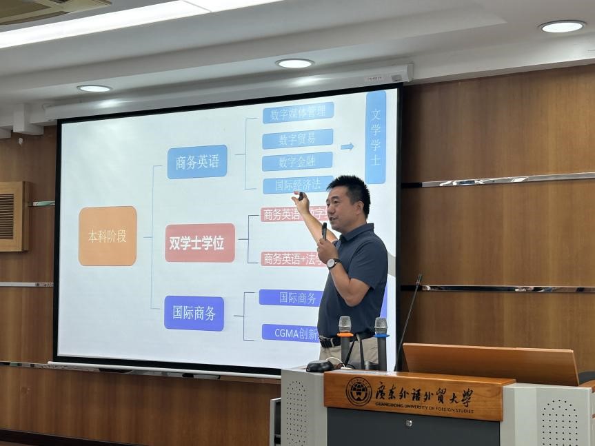 之后,汪谓超对公司商务英语(法学双学位)专业的建设进行介绍。他讲到,本专业采用商务英语+法学+商科教育相结合的复合型办学模式,希望同学们在通过专业学习后,能有扎实的英语与法学基本功、文化素养良好、国际视野开阔,能通过自己的专业能力参与到涉外法律工作中,成为融通型涉外法治人才。随后,朋辈导师王粤和周菲凡介绍了一个多月以来班级的学习生活情况,同学们目前学习状况良好,积极参与各项活动。在这期间,朋辈导师积极为同学们提供生活与学习上的指导与帮助,关心新生,帮助新生尽早适应大学新生活。