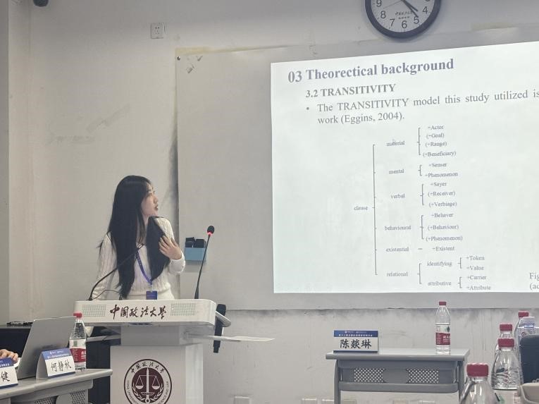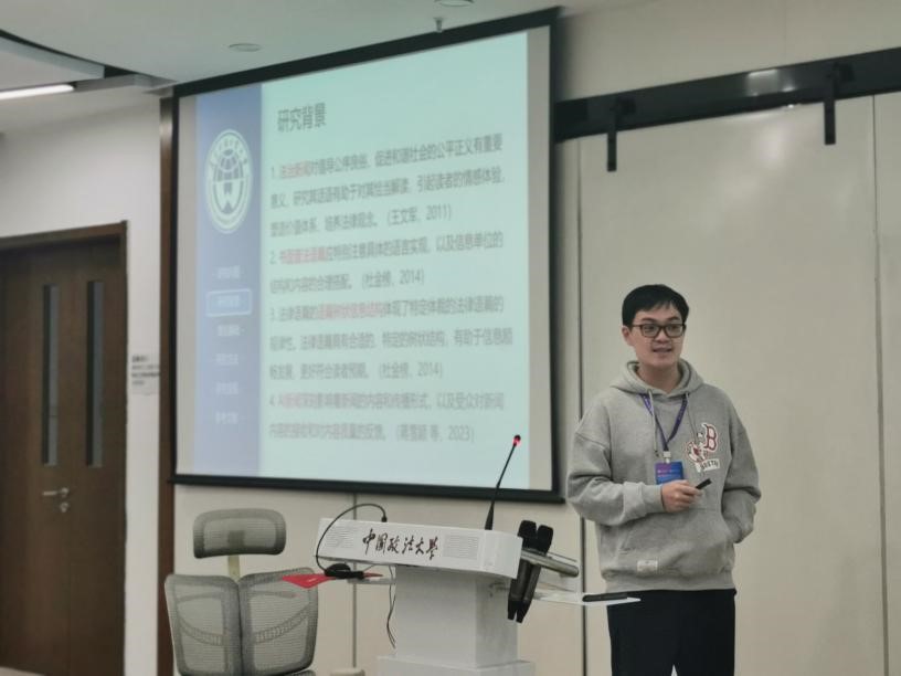 平行论坛共分为六个主题:AI与多模态、法律语言、文化与文学、法律与翻译、涉外法治人才培养、法庭语言及裁判文书研究、法律话语研究。五名研究生同学作为正式代表参会并宣读论文。徐佳英以《How to tell stories: Insights from a comparative study of opening statements in the George Floyd case》为选题,基于美国的热点时事——乔治-弗洛伊德(George Floyd)遇害案,分析语料库对备受关注的乔治-弗洛伊德案开庭陈述中的鉴定,运用评估系统考量乔治案中控辩双方如何进行陈述,采用定量与定性的方法,识别并比较双方使用的鉴定模式,综合分析了控辩双方在各自评价建构上对积极情感资源和消极情感资源的不同应用,观察开场陈述中的不同故事构建、叙事逻辑和人物描写,凸显情感和戏剧性叙事对陪审员认知塑造的关键作用。