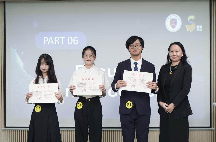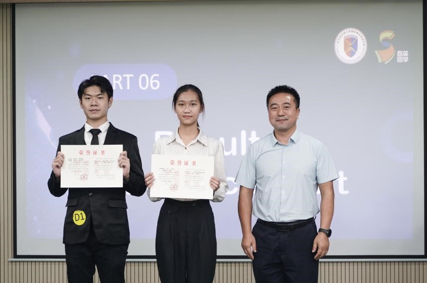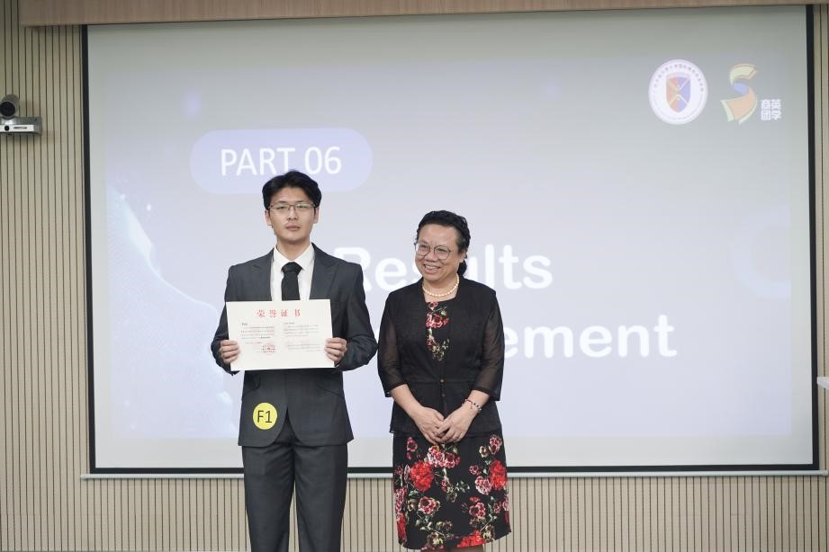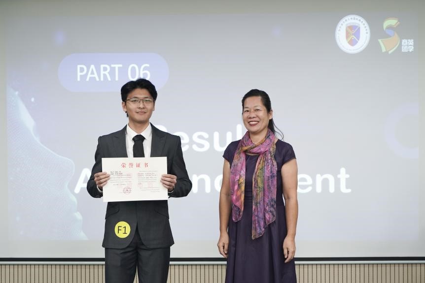 在每队五分钟的评委提问环节中,各位选手镇定自若,有条不紊,面对来自不同维度的提问,他们都能迅速组织语言,流畅作答,这一连串的表现无不彰显了选手们卓越的英语交流能力和从容不迫的心理素质。在评委点评环节中,Sherman老师对选手们的辛勤付出与出色表现给予了充分的肯定与赞赏,同时也中肯地指出了他们可进一步提升的空间。老师建议,在未来的比赛中,选手们应更加注重主题的深刻阐述,个人着装与仪态的得体展现,以及展示内容与问答环节时间的合理调配,以期在细节之处追求完美,进一步提升整体表现。