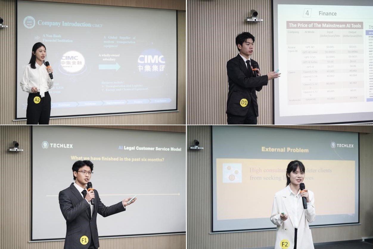 比赛过程中,参赛选手们在13分钟内从多方面全英解说各自队伍的调研成果,充分展示了公司学子扎实的英语素养和国际化的视野。Finlogers团队与CIMCF积极合作,深入企业走访调研,创造性设计了CIMA-Finlog体系。Aurora队深入探究了公司在人工智能领域所面临的机遇和挑战,旨在促进雀巢在人工智能应用方面更高效、更专业、更规范。Visionaries队顺应当下AI技术发展趋势,为公司定制了开发AI智能工期管理系统的方案,旨在推动制造业的转型升级,为社会创造更多价值。Original Intelligence队通过多次走访,频繁沟通。发掘企业存在的AI发展难题,并为其提供可行的解决方案,利用AI应用直击玩家痛点问题,为企业赢得了良好的企业形象。Supernova队的项目旨在为企业增收降本,提高工人生产效率,降低单位生产成本,双管齐下,帮助其在市场竞争中提升综合实力。TechLex队深入走访法律服务行业,分析了企业内部与外部的相关问题,逐步搭建起专业的法律服务人工智能体——小律同学,致力于用AI赋能法律服务行业。