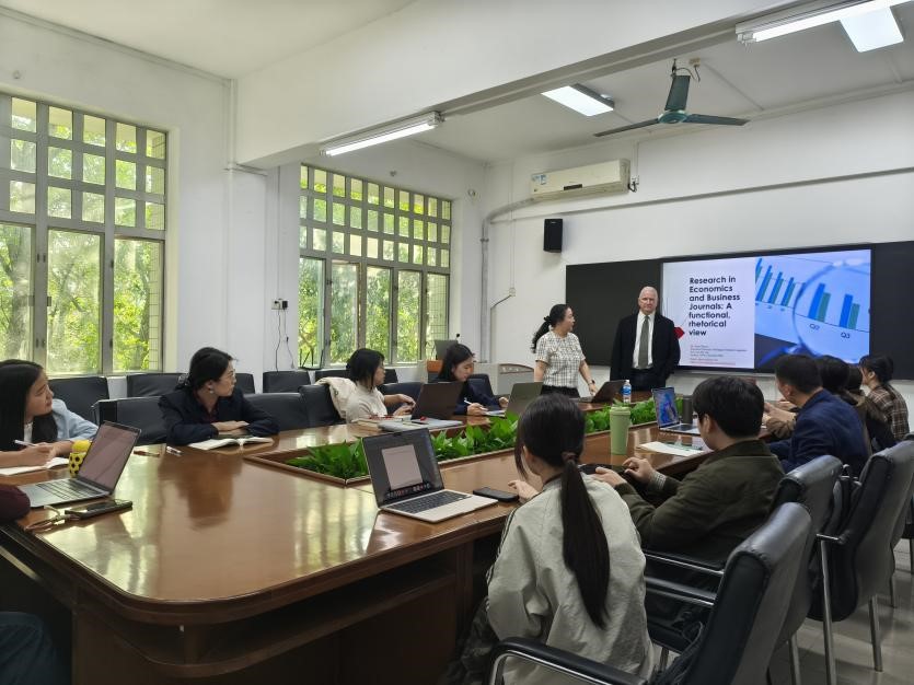 2024年12月26日14:30-16:30,公司云山讲座教授Terrence Royce 公司云山讲座教授Terrence Royce顺利开展商务英语研究专题系列讲座第三讲,主题为“Research in Economics and Business Journals: Introductions and Conclusions”讲座,徐玉婷老师主持。本次讲座围绕经济与商业领域期刊文章中引言与结论的写作展开,教授首先强调了引言和结论在学术写作中的关键性,并以大量的实例和分析展示了如何构建清晰且具有逻辑性的学术文本。本次讲座内容丰富、深入浅出,让师生们对学术写作中引言与结论的写作有了更深刻的理解。