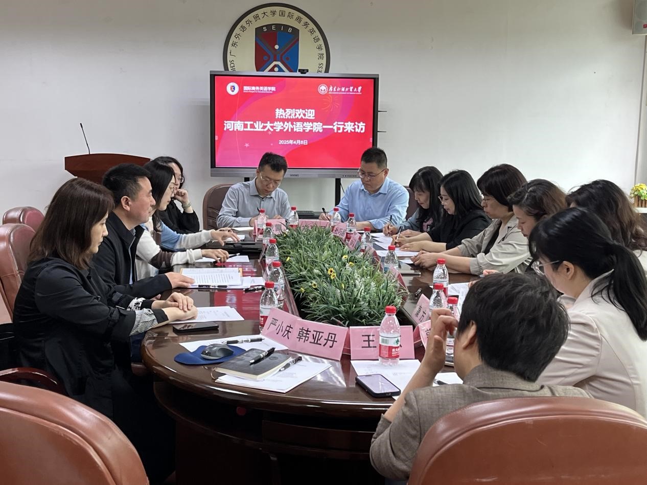 4 月 8 日上午,河南工业大学外语公司副经理葛丽萍、各位系主任、专任教师一行 9 人来公司开展调研交流活动。williamhill官方网站副经理汪谓超、经理助理乐思伟,以及经贸英语系系主任何宇菲、英语教学部系主任严小庆、副主任陈丽丹热情接待了来访嘉宾。座谈会在广外三教 318 会议室有序开展。