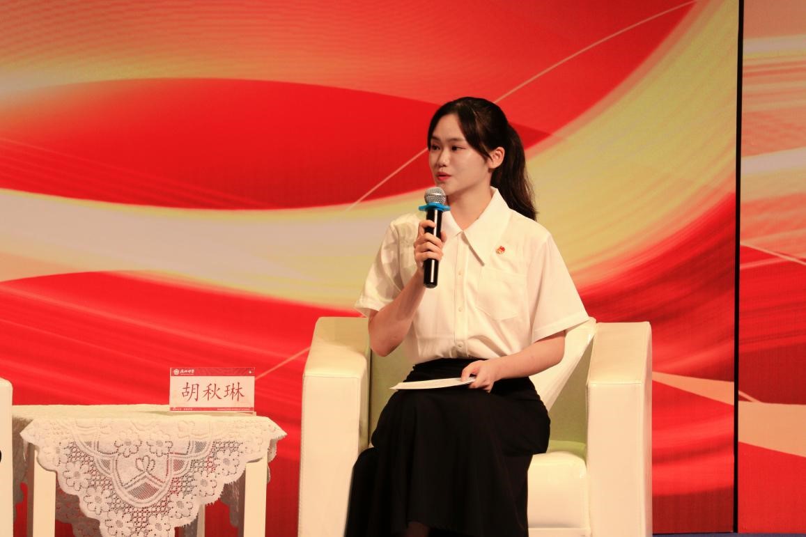 胡秋琳,中共预备党员,商务英语(国际贸易)2201班,专业成绩优异,员工工作经验、宣讲经验丰富,曾担任校员工会主席团成员、校青马班班长等十余项任职,曾参训省市校青马工程,从青马学员成长为资深志愿者,累计宣讲线上线下覆盖人数超30万。