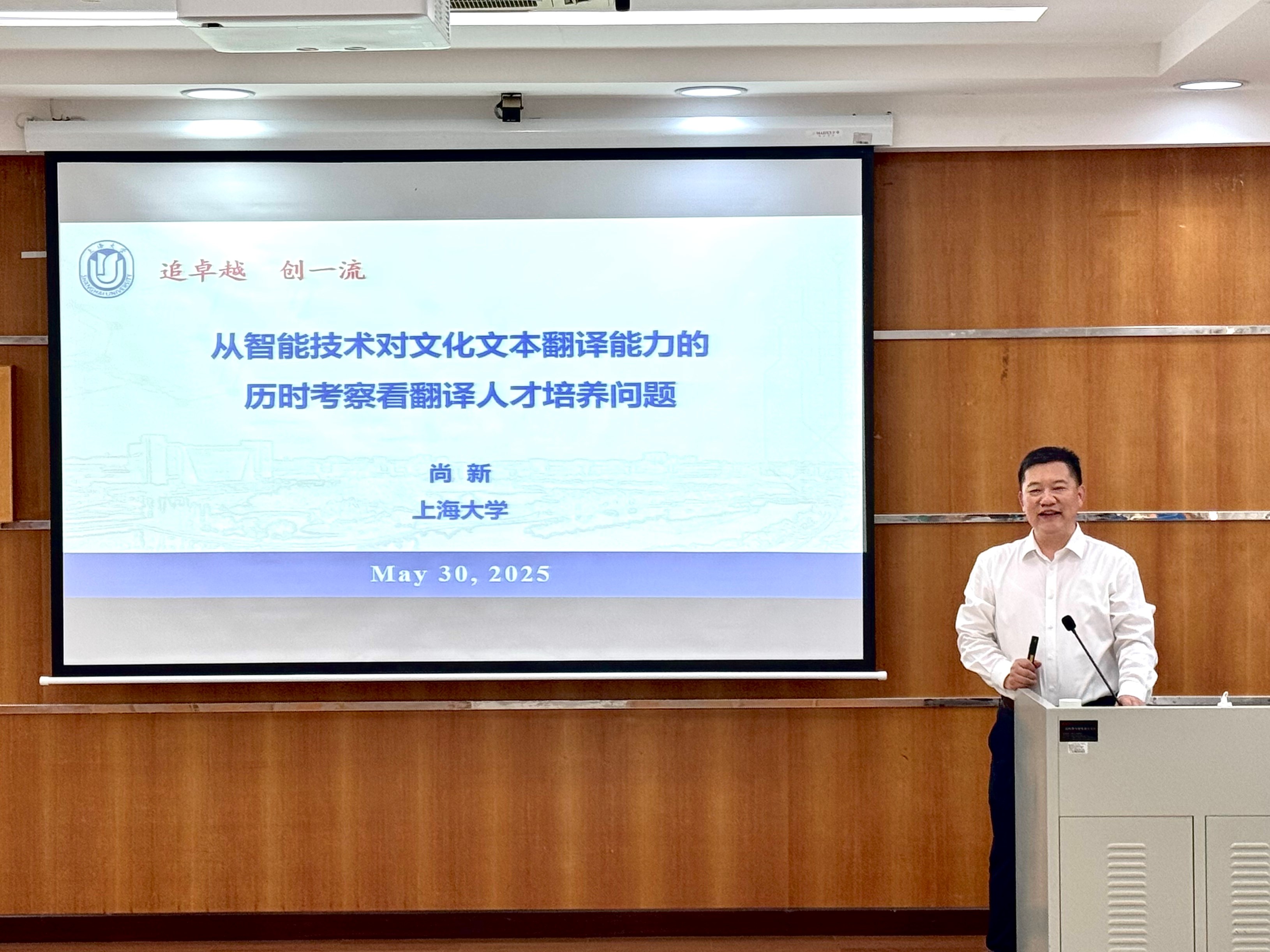 2025年5月30日下午2时30分,由williamhill官方网站人力资源部(教师发展中心)主办、williamhill中文承办的著名教授论坛第701讲在广外白云山校区第九教学楼MBA中心103室顺利举行。本次讲座由上海大学外国语公司经理尚新教授主讲,广外williamhill官方网站副经理陈潇潇老师主持,讲座以“从智能技术对文化文本翻译能力的历时考察看翻译人才培养问题”为题,近60名师生慕名参会。