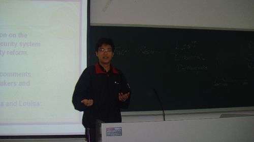 随后进行的小组讨论与展示将研讨会的气氛推向最高潮。在座的员工被随机分为五组,在规定时间内用英文就中美的社会保障制度进行对比,并对中国社保制度改革提出可行性建议。讨论中同学们广开言路、畅所欲言,为中国社保改革出谋献策,时时迸发出思维的火花。每组选出的上台陈述的代表,凭借着自信沉着的台风、流畅优美的英语、新颖深刻的内容获得一致好评,发言中时时闪现出“延迟退休年龄”、“推进制度一体化”等独到见解。其中第四组同学更以幽默风趣的语言对中美社保制度进行了数据对比,提出了社保预算上的改进,博得外籍教授及在场师生的阵阵掌声。同时,每组同学还要面对主讲人和三位《商务综合英语》老师的犀利问题。