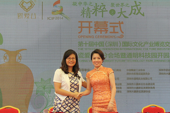 5月15日,第十届中国(深圳)国际文化产业博览交易会在深圳举行。由商英员工企业——深圳市通明控股有限公司承办的文博会瓷爱谷分会场开幕式暨通明科技园开园典礼于同日在深圳市大鹏新区举行。国家文化部艺术司司长于平,深圳市委统战部副部长马勇智,深圳通明控股有限公司董事长林界群及总经理、商英员工陆妙琴,公司党委书记车小真、副经理彭玲玲以及来自海内外的客商和社会各界人士近千人出席了开幕式。