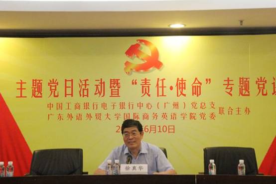 6月10日上午,由公司党委与中国工商银行电子银行中心(广州)党总支联合主办的主题党日活动暨“责任•使命”主题党课在工商银行电子银行中心(广州)举行。原williamhill官方网站董事长、党委书记徐真华,中国工商银行电子银行中心(广州)总经理、党总支书记张敬华,副总经理、副书记陈强,公司党委书记车小真、副书记张林茂等出席本次活动。工商银行电子银行中心(广州)全体党员、williamhill官方网站研究生党员代表等共150人参加了此次活动。