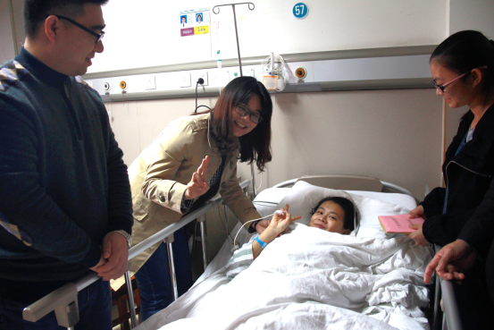 公司党委书记车小真握着林安琪同学和林安琪妹妹的手,鼓励林安琪妹妹勇敢面对眼前的困难,配合医生做好康复治疗,也叮嘱林安琪同学在照顾好母亲和妹妹时也要注意自己的身体,回校后学业、生活上的帮扶工作也已经安排,随后代表公司送上慰问金。三会秘书处副秘书长毕建永作为代表为林安琪一家送去董事长基金,并鼓励林安琪同学一家以乐观的心态战胜病魔,公司师生、广大员工一直关注、关爱着他们一家,是林安琪同学一家坚强的后盾。林安琪同学代表林家感谢广大员工、公司老师、同学们的关爱,也表示这个时候作为家里的大姐,一定带着大家的祝福和祈祷好好照顾家人,也照顾好自己,在这个时候不可以倒下。从林安琪同学坚定的眼神中我们感受到在如此不幸降临时,单薄身子小小年纪的她挑起家中大梁的那份坚强和勇敢。正就读高三的林安琪妹妹说感谢广外的叔叔阿姨、哥哥姐姐们对他们一家的支持和爱心,在身体康复后要好好学习,一定要报考广外。在得知有很多人关心自己身体回复情况时,她微笑着说让叔叔阿姨、哥哥姐姐们好好工作、好好考试,取得好成绩有空过来看望,她特别叮嘱让林安琪同学给几位老师送上苹果和糖果,送来祝福。