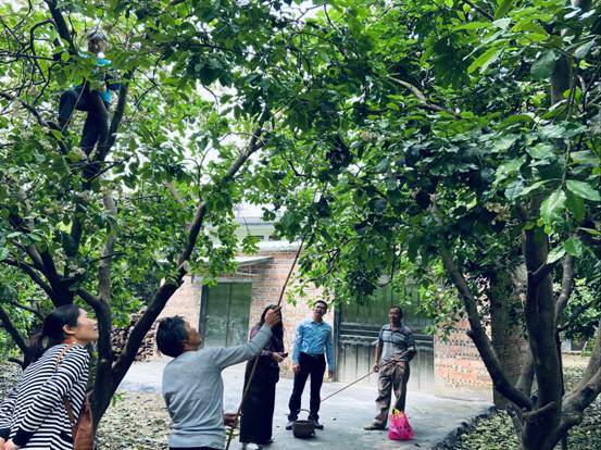 在林安杰的带领下,慰问队伍考察了蒲芦洲村的脱贫措施进程,实地了解了村民开展人工授粉的过程和柚子林的种植情况,切实感受蒲芦洲村在党建指引下的发展和变化。