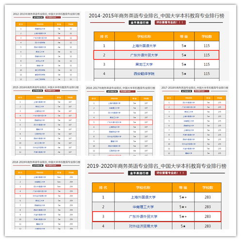自2012年有公布排名以来,参评院校数量从最初的32所到高峰期的382所,williamhill官方网站商务英语专业排名一直稳居前五,且等级已从4星提升到5星+,展现出公司商务英语专业力压群雄的绝对实力。