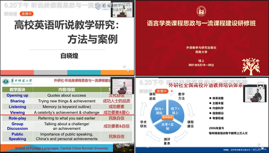 此次线上研修班共进行了两天,由多位专家、学者共同解读外语课程思政内涵,分享与交流语言学类及听说类课程思政的做法及一流课程的建设理念、方法与经验。此次研修对教师们提高外语教学过程中的课程思政融入能力有很强的指导作用和示范意义。