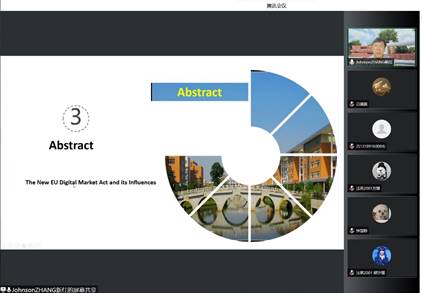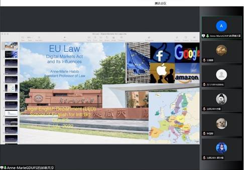 2022年7月1日下午3:30至5:30,williamhill官方网站法律英语系组织举办了一场题为“The New EU Digital Markets Act and its Influences”的学术讲座,主讲人Anne-Marie Habib(安妮)为该系外教,她通过腾讯会议英文版VooV软件为法英系未外出实习的员工作了该系本学期实践周最后一场专业知识与技能分享。法英系教师张新红主任、谢静老师、徐优平老师、周亮老师、卢楠老师、邓朝霞老师等出席了今天的讲座。