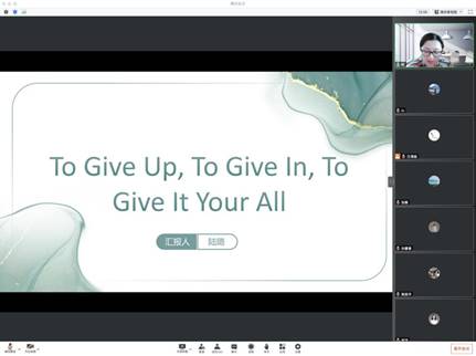 首先,陆璐副教授结合自己撰写论文及申报项目的经历,总结出失败的原因,指出自己对“木桶原理”的新理解。在第二部分,陆璐老师提出“仰卧起坐太累的话,试试卷腹吧”的观点。她认为通往成功的道路不止一条,遇到瓶颈时不妨转换角度,从简单的地方入手,慢慢靠近成功,在自己的舒适圈里寻求突破。陆璐老师还分享了自己如何在热爱和擅长的领域突破创新。首先,陆老师建议找好国家政策的方向标,并向参会老师推荐关注由外研社出版的《理解当代中国》教材。她从自身研究方向转变的经历,提议应从社会大环境入手,从国家政策导向寻找突破点。其次,陆老师认为应把兴趣点与成果连起来。她从自己带员工比赛、到自己参赛、再到以赛促学的经验探索中,反思总结了成功和失败的关键就在于问题导向。因此,陆老师最后总结深入的学习与研究的最终导向是解决问题。从兴趣点出发,保持良好的心态,及时根据社会大环境进行调整,留心日常生活工作中的现象,实现自己擅长的领域中突破创新。