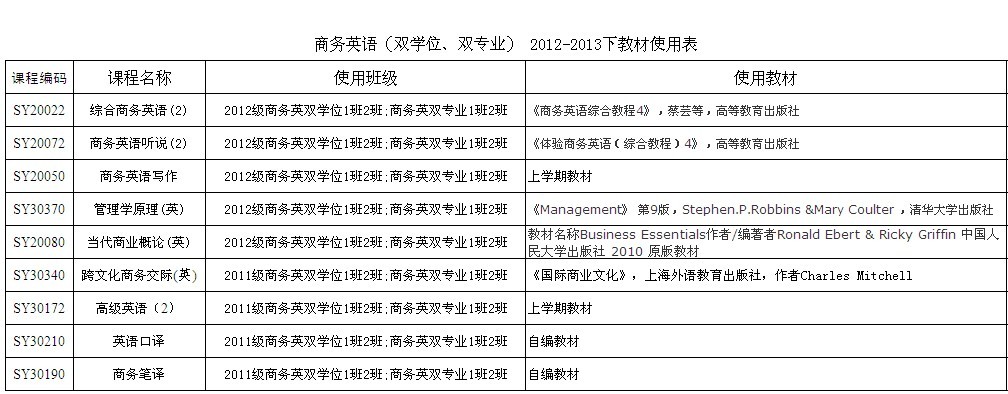 2012-2013下学期双学位双专业使用教材