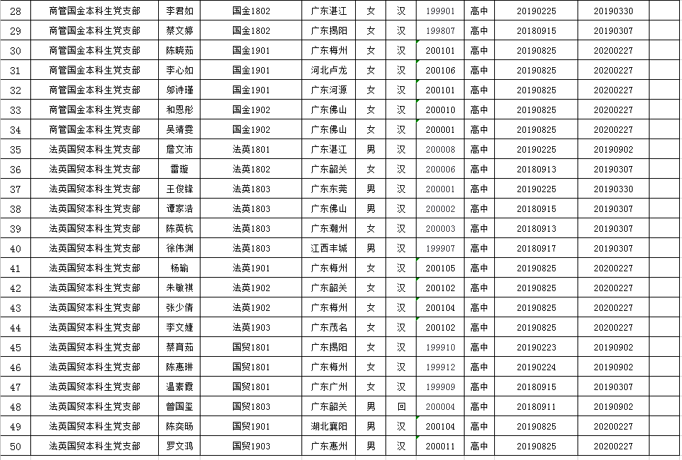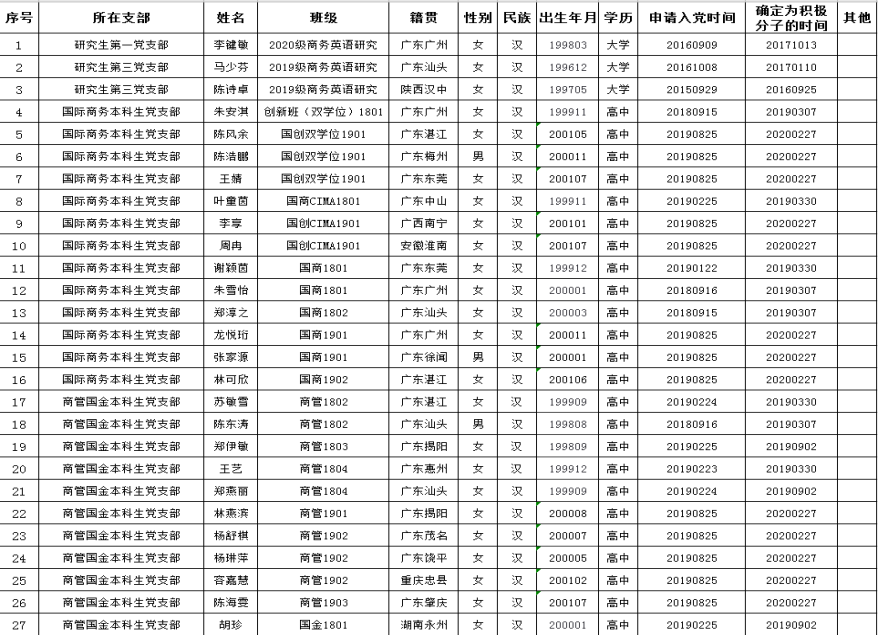经过党支部1年以上的培养、教育、考察,拟将李键敏等50名同志确定为发展对象,根据发展党员工作有关要求,现将其有关情况公示如下: