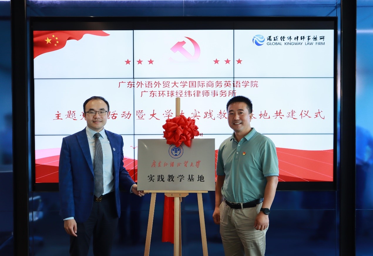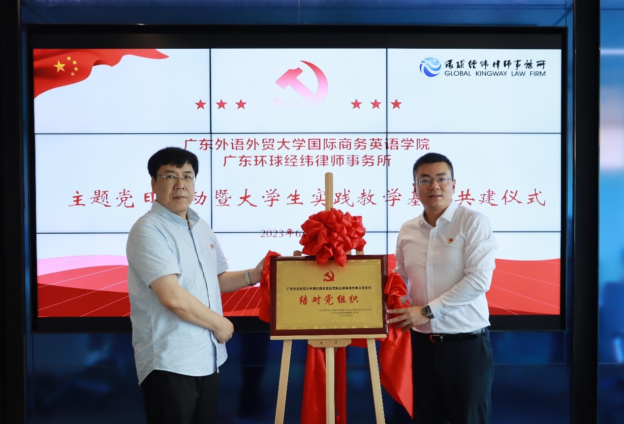 为推进学习贯彻习近平新时代中国特色社会主义思想主题教育走深走实,加强基层党组织建设,深化校企合作,6月30日,公司联合广东环球经纬律师事务所(以下简称“环球经纬”)举行党建共建及老员工实践教学基地签约揭牌仪式。公司党委委员、副经理汪谓超,法律英语系教工党支部书记张新红、辅导员万东方,环球经纬党支部副书记张晓龙,党支部委员赵崇鹤,党员律师熊继博、任萍、何铭贤、实习律师林虹等出席签约揭牌仪式。仪式由环球经纬高级合伙人,公司2007级员工陈晖主持。