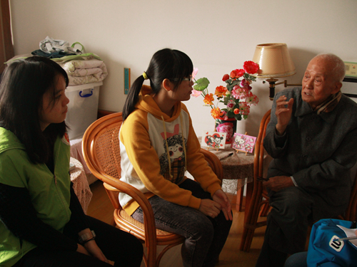 93岁的黄爷爷对志愿者们的到来显得十分高兴,热情地招呼志愿者们吃核桃,和志愿者们聊起了年轻时的往事。虽然黄爷爷已有93岁,但仍然一身轻健,耳聪目明,他与志愿者们说起健康的秘诀——每天都在院子里走4500步,还鼓励志愿者们多多参加体育活动。志愿者和黄爷爷的聊天气氛非常轻松愉悦,黄爷爷丰富的人生经历也让志愿者们获益良多。