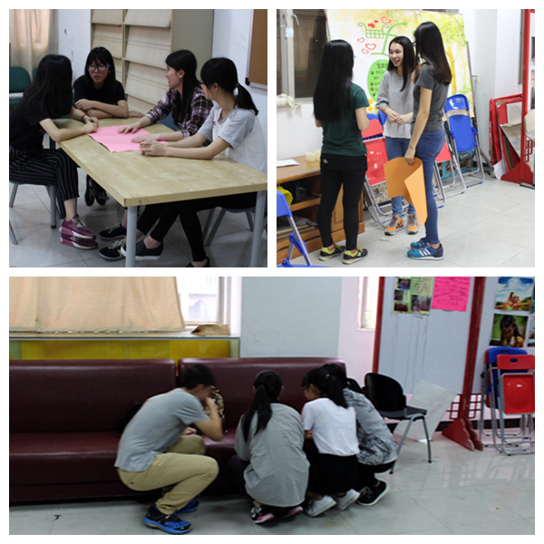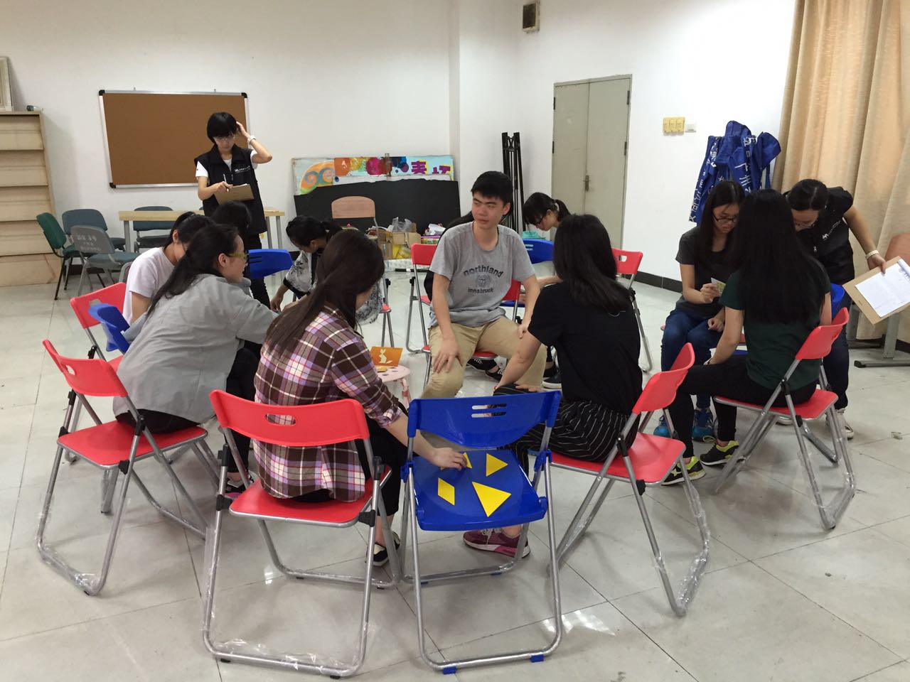为了更好熟悉彼此,全部人被随机分成了几组,以组为单位进行第一个项目——“风中传话”,每组站成一纵列,第一个组员只能以固定的四个手势在下一个人的背上传递出题人所给的数字信息,最后一个组员说中答案即算成功。虽然最后一题有点难度没有组完全答对,但大家还是满脸笑容,非常享受游戏的过程。接下来的休息娱乐时间,每组有二十分钟来准备一个主题为“风雨奇缘”的小短剧,热火朝天的小组讨论和准备后,每组的短剧正式开演。看了风格迥异略显搞笑的三部短剧后,大家都乐开了花,欢快的氛围环绕着我们每个人。而最后一个培训项目则是一场形式特殊的拼七巧板比赛,考研团队的合作选出一人为领队,剩下的人两两一组在规定时间内完成相应任务卡上的三个任务,但由于提供的七巧板资源有限,需要通过领队来合理配置资源给组员,以助各组完成各自的任务。各组成员不仅是紧张完成自己的任务,在必要的时候交换七巧板或是借出自己的七巧板协助别组完成任务。刚开始大家由于没有经验进行得不是很顺利,但是随着对规则的熟悉程度加深,大家的进度越来越快,最终在通力合作中完成了所有任务。