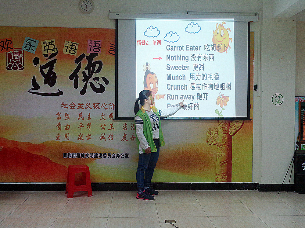 志愿者姐姐要开始教话剧里的单词啦!小朋友们在志愿者的带领下跟读一个个单词,当检验单词教学情况的时候,小朋友们大声地把相对应的英文读出来,细心的志愿者们见到个别沉默的小朋友,则蹲在他们的身旁,轻声引导着他们开口跟读。