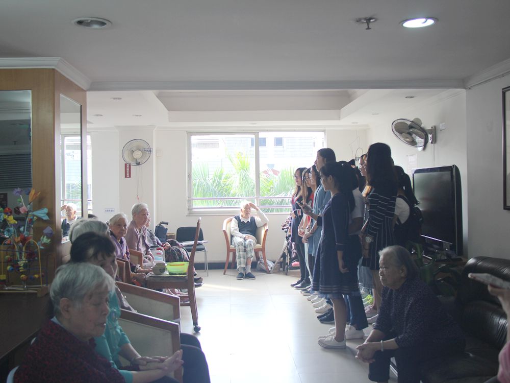 “感恩的心,感谢有你。”和着从敞开的窗外吹来的徐风,肩并肩立在淡白的光线下的志愿者们轻轻地为老人们唱起一首《感恩的心》。老人静静地听着这首耳熟能详的表达着感恩、感激之情的歌,静静地凝望着同学们年轻而朝气蓬勃的脸庞,也许是回忆起了心中弥足珍贵而值得感恩的人和事。