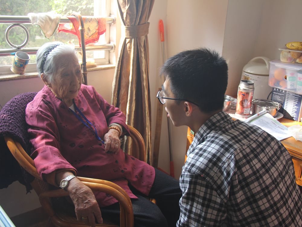 走进其中一个十分整洁舒适的房间,屋内的老人正在看粤剧。看到志愿者们的进来,她连忙高兴得起身,热情亲切地握着志愿者的手。通过一番畅谈,志愿者们了解到这位老奶奶是一位非常开朗、开明而且有追求的人。而让人惊讶的是,看上去神采奕奕的她如今已是92岁高龄。老奶奶平常喜欢看报纸,听听粤剧,在生活中十分关注国家及社会上发生的大事小事。即便很少有家人的陪伴,老奶奶脸上仍然时常洋溢着欢快的笑容。她说,笑容总能带走忧愁与悲伤,人应该多笑笑,才能活得好,对得起自己。